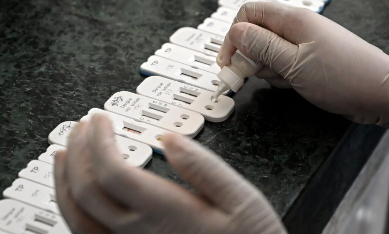 Um técnico médico coleta uma amostra de sangue de um paciente no Nepal, onde profissionais de saúde do governo dizem que a dengue não é mais uma tendência cíclica.