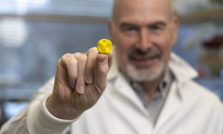 Scott Hollister com a válvula cardíaca biorresorbável impressa em 3D. Crédito: Instituto de Tecnologia da Geórgia
