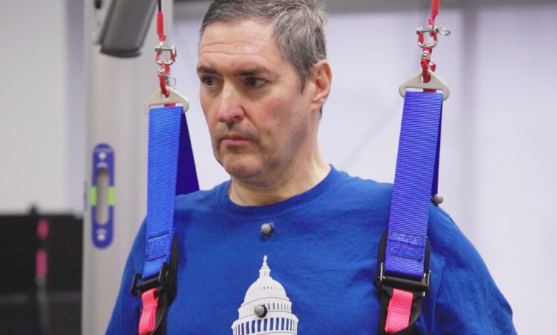 Esta imagem do vídeo fornecida pela UPMC e pela Universidade de Pittsburgh Health Sciences mostra Doug McCullough, que tem atrofia muscular espinhal, durante testes de estimulação experimental da medula espinhal para melhorar a função muscular em Pittsburgh, em 14 de março de 2023. Crédito: UPMC, Universidade de Pittsburgh, Ciências da Saúde via AP