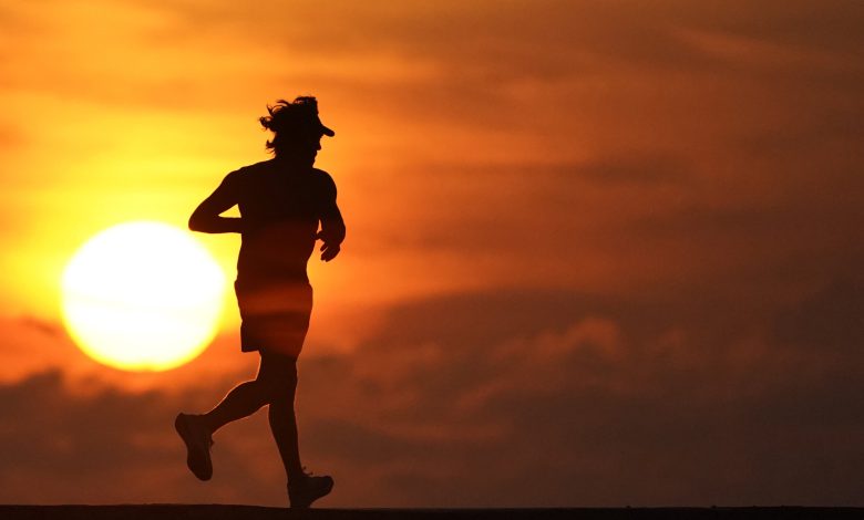 Um corredor é silhuetado enquanto corre em um cais ao nascer do sol sobre o Oceano Atlântico em Bal Harbor, na Flórida, em 19 de setembro de 2020. Crédito: AP Photo/Wilfredo Lee, arquivo
