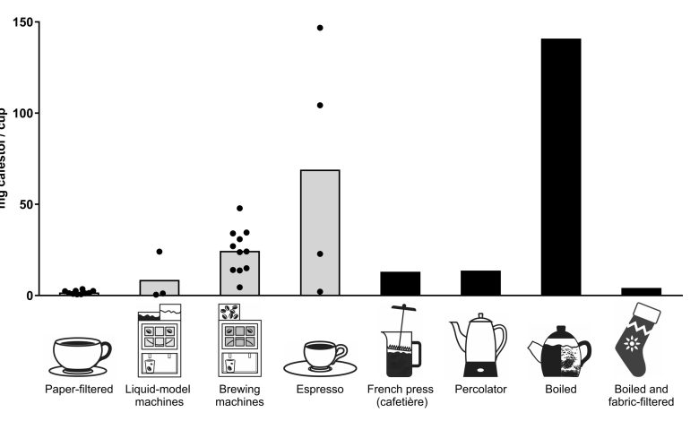 O tipo mais comum de máquina de café, no estudo chamado máquina de fabricação de cerveja, é a que produziu café com as maiores concentrações de diterpenos. Em análises comparativas, os pesquisadores investigaram café percolator, café expresso, café francês, café cozido e café cozido derramado através de um filtro de tecido. O café cozido continha os níveis mais altos de diterpenos por xícara. Algumas amostras de café expresso também continham altos níveis, mas houve uma grande variação.