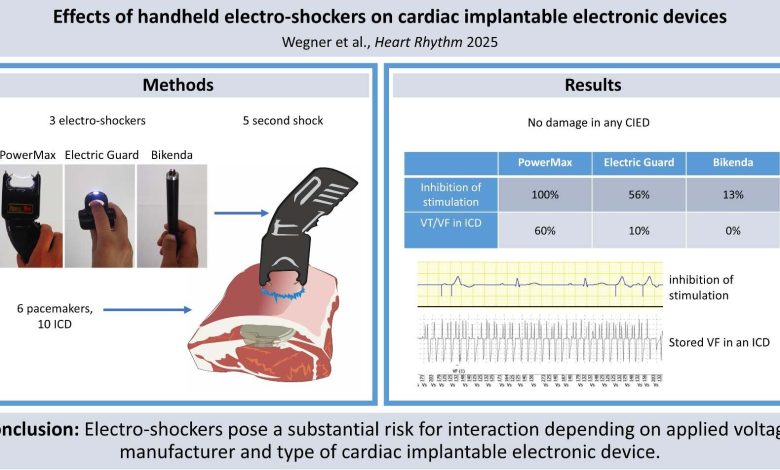 Descobertas relatadas em Ritmo cardíaco Detalhe a interação entre os eletro-shockers portáteis comumente usados ​​para autodefesa e dispositivos eletrônicos implantáveis ​​cardíacos. Esta imagem mostra os principais resultados do estudo. Crédito: Ritmo cardíaco / Wegner et al.