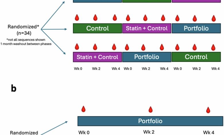 Para o primeiro estudo, 34 participantes foram colocados em três grupos: um grupo de dieta do portfólio, um grupo de dieta controle e uma dieta de controle combinada com um medicamento para baixar o colesterol. No segundo estudo, 25 participantes estavam em dois grupos, um grupo de dieta e grupo de controle do portfólio.