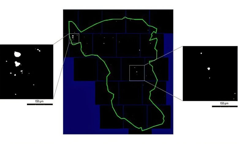 Amostra de tecido analisada com µ-pixe. A linha verde descreve o perímetro da amostra. As micropartículas de titânio aparecem como objetos brancos dentro da amostra. Detalhes ampliados ilustram micropartículas com tamanho e morfologia variados. Crédito: Medicina de Comunicações (2025). Doi: 10.1038/s43856-025-00756-3