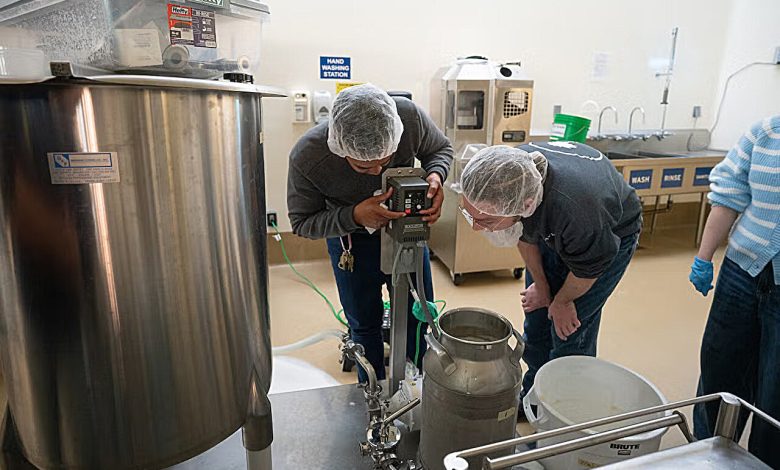 Amy Fletcher, gerente de fábrica piloto, e Reid Waterman, especialista em ciências de alimentos do terceiro ano, iniciam a máquina de sorvete nas instalações de processamento de alimentos piloto no campus da UC Davis. O sorvete comprado na loja geralmente se enquadra na categoria de alimentos “ultraprocessados”. Crédito: Alysha Beck/UC Davis