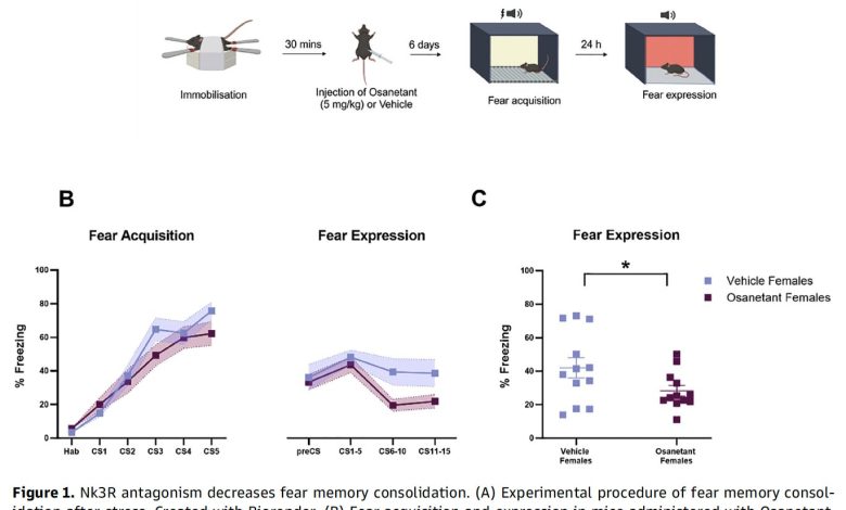 Um novo relatório publicado em Medicina do cérebro revela que uma dose única da droga osatant, administrada logo após um evento traumático, amortece significativamente a expressão do medo em camundongos femininos. Os achados fornecem forte suporte pré-clínico ao uso do antagonismo de NK3R como uma intervenção sensível ao tempo específica do sexo para reduzir o risco de transtorno de estresse pós-traumático (TEPT).