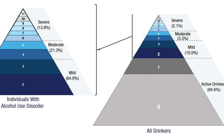 Prevalência de AUD, níveis de gravidade AUD e contagem de sintomas variáveis. Os dados foram extraídos dos 22.177 bebedores ativos que participaram da Onda 2 do Pesquisa Epidemiológica Nacional sobre Alcoolismo e Condições Relacionadas. Os números refletem a contagem de sintomas de acordo com os critérios de diagnóstico do DSM-5 AUD (0-11; American Psychiatric Association, 2013). A área de cada segmento do triângulo é proporcional à porcentagem da amostra que endossou um determinado número de sintomas e/ou atendeu aos critérios para um determinado nível de gravidade AUD. Veja também Lane e Sher (2015). AUD = Transtorno do uso de álcool; DSM-5 = Quinta edição do manual de diagnóstico e estatístico de transtornos mentais. Crédito: Direções atuais em ciências psicológicas (2025). Doi: 10.1177/09637214251318272