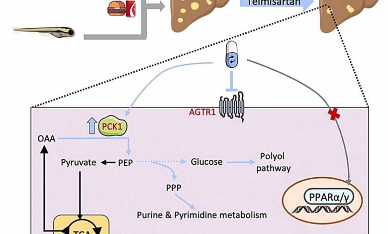 Os pesquisadores descobriram agora que a quantidade de proteína PCK1 no fígado dos animais MASLD foi reduzida e que o tratamento com telmisartan restaurou seus níveis ao normal. “Esse aumento no PCK1 desvia o fluxo de metabólitos da síntese lipídica para a síntese de glicose. Esse aumento na produção de glicose pode ser negativo se a glicose fosse exportada e acumulada no sangue, pois poderia levar ao diabetes, mas percebemos que esse não é o caso”, diz Alret.