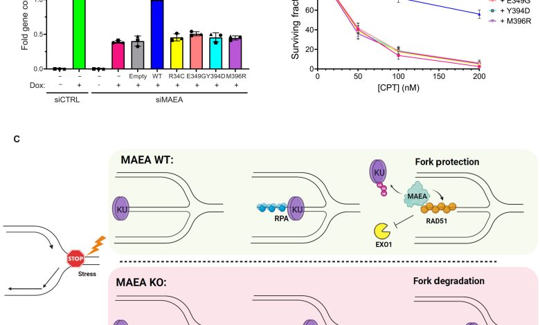 Elham Zeinali et al, Variantes patogênicas em MAEA interrompem a estabilidade do garfo de replicação do DNA e estão associadas a anormalidades de desenvolvimento em humanos, Avanços da Ciência (2025). DOI: 10.1126/sciadv.adv0381