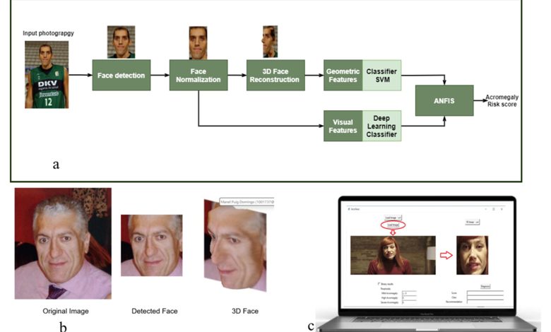 O artigo publicado na revista descreve um sistema de reconhecimento facial baseado em IA, chamado AcroFace, que poderia detectar acromegalia simplesmente analisando fotografias faciais. Especificamente, faz isso analisando características visuais (a aparência e textura do rosto) e características geométricas (medidas e distâncias entre pontos de referência faciais, como olhos, nariz e mandíbula).