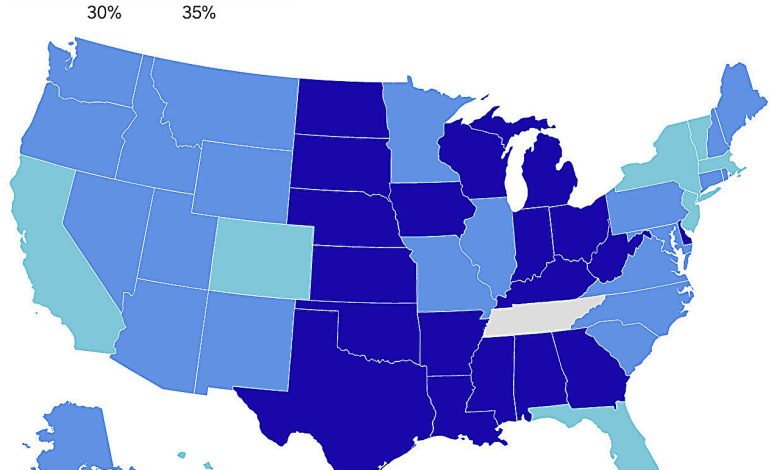 O mapa acima mostra a parcela obesa da população de cada estado. Crédito: AP Digital Embed