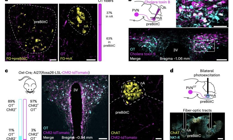 As fibras OT do PVN caudal ao preBötC/nA podem amplificar o RespHRV, diminuir a FCM e aumentar a frequência respiratória em camundongos adultos que se movem livremente em repouso. Crédito: Buron et al. (Nature Neurociência, 2025).