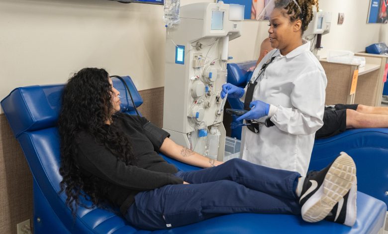 O flebotomista Latasha Hamilton (à direita) prepara Gabriela Moreno (à esquerda) e o equipamento para doar plasma, um processo que leva menos de uma hora. Crédito: Associação de Terapêutica de Proteínas Plasmática