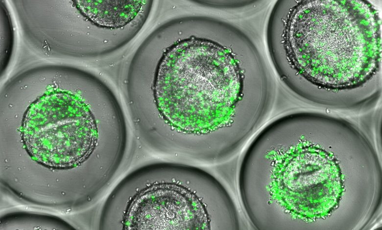 Exemplo de organoides de fígado humano cocultivados com células T CD8 autólogas (verde). Esses tecidos podem ser usados durante o desenvolvimento de medicamentos para prever a toxicidade hepática, de acordo com uma nova pesquisa publicada por especialistas do Cincinnati Children’s. Crédito: Cincinnati Children’s