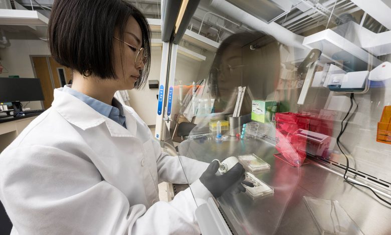 Lastragem: Ph.D. de engenharia biomédica. O aluno Kaihua Chen, membro da equipe do professor de Urochester, James McGrath, prepara chips de tecido para experimentos. Crédito: University of Rochester Photo / J. Adam Fenster
