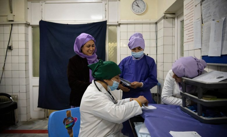 Dentro de uma sala de parto no Hospital Nacional e Especializado de Malalai de Cabul, as parteiras em treinamento ajudam a entregar bebês sob a supervisão da parteira da cabeça. Crédito: Who / Kiana Hayeri