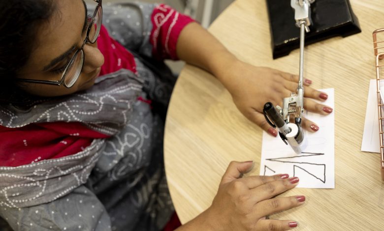 Um participante do estudo costurando na câmara climática da Universidade de Sydney. Crédito: Louise Cooper, Universidade de Sydney