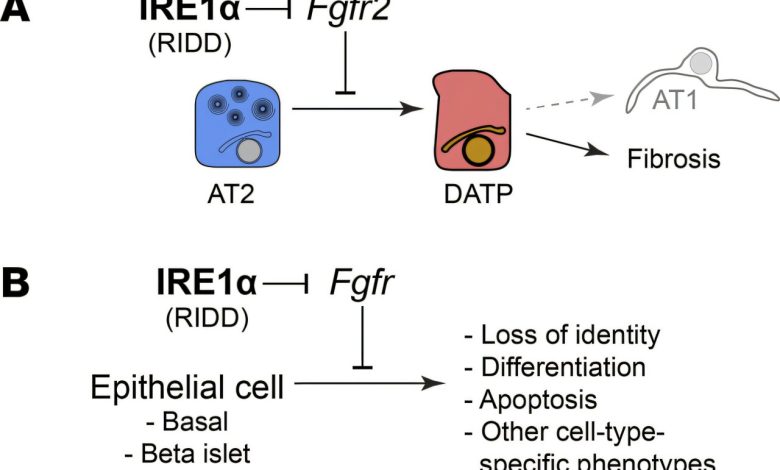 A) Modelo de controle IRE1α da plasticidade AT2 e promoção de fibrose por RIDD e regulação negativa de Fgfr2. B) Modelo de modulação IRE1α da sinalização Fgf e potenciais efeitos em outros tecidos epiteliais. Crédito: Jornal de investigação clínica (2025). DOI: 10.1172/jci184522