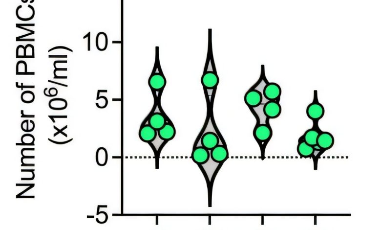 O paclitaxel não altera o número de PBMCs circulantes. Células mononucleares do sangue periférico (PBMCs) foram isoladas de camundongos C57BL/6J do tipo selvagem (WT) sob condições virgens (N; n = 4) ou após tratamento com paclitaxel no dia 0 (ciclo 1; C1; n = 4), dia 2 (ciclo 2; C2; n = 4) e dia 4 (ciclo 3; C3; n = 5). O número de PBMCs foi quantificado utilizando corante azul de tripano e apresentado em milhões por ml. O gráfico do violino mostra todos os pontos, os dados são mostrados como mediana ± quartis. ANOVA two-way (teste de Tukey) foi utilizada para análise estatística. Crédito: Medicina Translacional Científica (2025). DOI: 10.1126/scitranslmed.ady5288