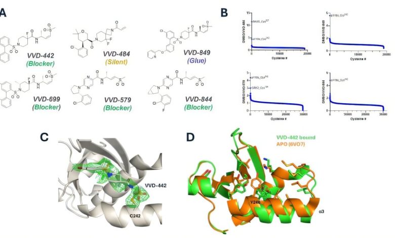 (A) Estrutura química dos ligantes VVD utilizados no manuscrito. (B) Seletividade proteômica global de VVD-484, VVD-849, VVD-579 e VVD-844. As células foram tratadas com 10 µM de VVD-484, 2 µM de VVD-849 ou VVD-579 ou 1 µM de VVD-844, que é ~25 vezes maior que TE50S. 20.000-30.000 peptídeos contendo cisteína foram medidos usando quantificação de TMT para cada composto. (C) FO-FC omite mapa contornado em 2,5 σ mostrando densidade contínua para VVD-442 e uma ligação covalente formada com Cys242. (D) Superposição do APO (PDB ID 6VO7) e domínio de ligação ao RAS ligado, destacando a mudança em α3 e o movimento de Tyr246 necessário para ligação de compostos. Crédito: Ciência (2025). DOI: 10.1126/science.adv2684