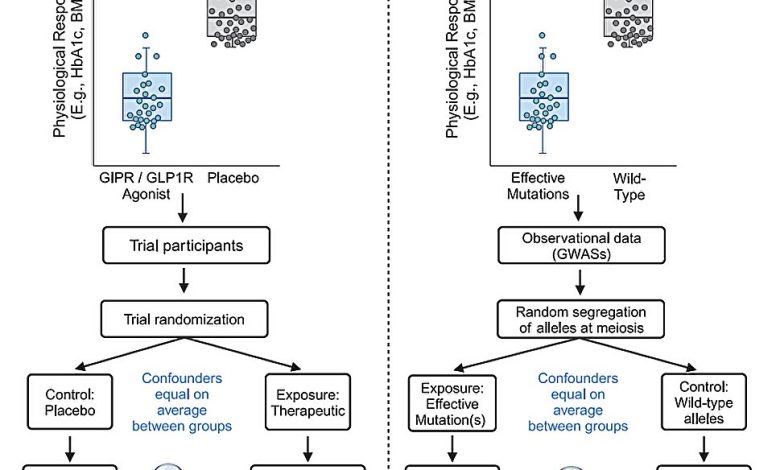 ![Comparação da randomização mendeliana de alvo de drogas (DTMR) com ensaios de controle randomizado (ECRs) (adaptados de Chauquet et al. [90]). O projeto para a ECR hipotética AA que investiga o impacto dos agonistas GIPR/GLP1R nos comportamentos de consumo de álcool, saúde hepática e preferências alimentares é comparada à análise de RM de alvo de BA que avalia o impacto de associações geneticamente proxiadas da atividade GIPR/GLP1R. Em B, polimorfismos de nucleotídeo único (SNPs) localizados dentro ou perto dos locos genômicos e associados ao impacto fisiológico a jusante emulam terapêutica GIPR/GLP1R (hemoglobina glicada reduzida [HbA1c] ou baixo índice de massa corporal [BMI]). Crédito: Reitz et al. (Molecular Psychiatry, 2025). Medicamentos de diabetes que mostram promessa para o tratamento do distúrbio do uso de álcool](http://scx1.b-cdn.net/csz/news/800a/2025/diabetes-drugs-found-t.jpg)
