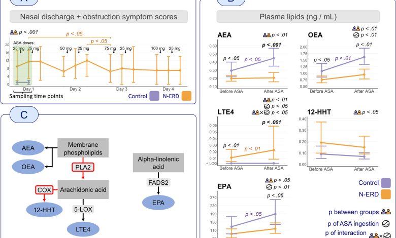 Painel A: Pontuações somadas da escala visual analógica (VAS) para secreção nasal e sintomas de obstrução durante desafio com ASA. Painel B: Os gráficos de linha ilustram as concentrações de mediadores lipídicos em ambos os grupos (controle e N-ERD) antes e 2 horas após a ingestão de 25 mg de AAS. Crédito: Alergia Clínica e Experimental (2025). DOI: 10.1111/cea.70145