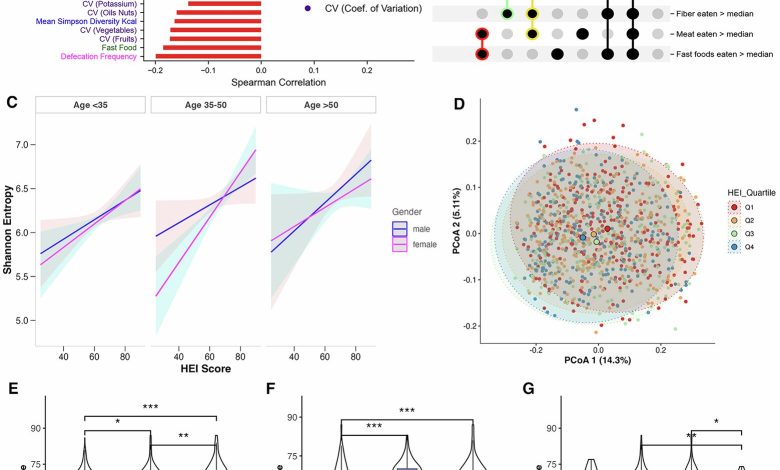 Comparação da diversidade alfa entre fatores fisiológicos e dietéticos e diferenças demográficas em relação a subconjuntos de indivíduos que diferem pela ingestão nutricional mediana (g/dia). Crédito: Comunicações da Natureza (2025). DOI: 10.1038/s41467-025-63799-z