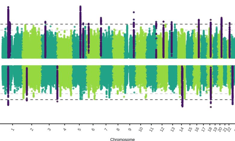 Gráfico de Miami da meta-análise do estudo de associação genômica ampla estratificada por sexo (GWAS) do Transtorno Depressivo Maior (TDM), com meta-análises femininas e masculinas mostradas na parte superior e inferior, respectivamente. Crédito: Comunicações da Natureza (2025). DOI: 10.1038/s41467-025-63236-1
