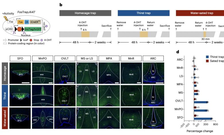 Os perfis de ativação dos neurônios da EM respondem às alterações nos fluidos corporais. a, Estratégia de rotulagem Fos usando um sistema TRAP2. b, Cronogramas experimentais para identificar a ativação cerebral induzida pela sede ou saciedade de água usando um ensaio FosTrap em camundongos TRAP2 × Ai47. c, d, Imagens confocal representativas (c) e quantificação (d) de alterações na expressão de Fos nas regiões a montante do SFO sob diferentes condições (n = 3 em cada grupo), conforme indicado acima. Crédito: Xu et al. (Neurociência da Natureza, 2025).