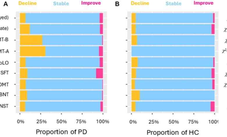 Gráficos de barras empilhados mostrando a distribuição de indivíduos nos grupos PD (A) e HC (B) que diminuíram, permaneceram estáveis ​​e melhoraram entre os testes cognitivos iniciais e de acompanhamento de 1 ano. Crédito: Jornal da doença de Parkinson (2025). DOI: 10.1177/1877718×251339585