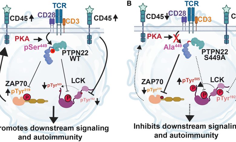 Shen Yang et al, o feedback retrógrado de fosfatase dupla PTPN22-CD45 melhora a sinalização e a autoimunidade do TCR, Avanços da Ciência (2025). DOI: 10.1126/sciadv.adw2568