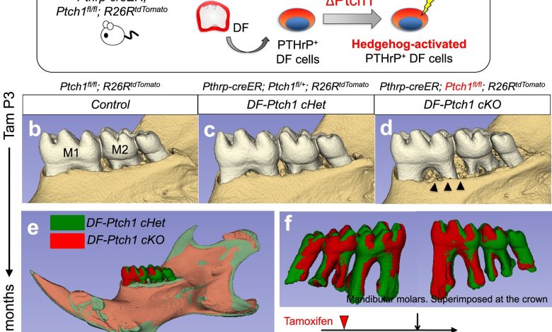 Impacto da ativação constitutiva do ouriço no PTHRP+ Células DF na formação óssea alveolar. um Diagrama de condicional PTCH1 exclusão no PTHRP-CREER+ Células DF. b–f Imagens 3D-µCT de molares mandibulares de PTCH1fl/fl; R26Rtdtomato (Controle) (b), PTHRP-CREER; PTCH1fl/+; R26Rtdtomato (DF-PTCH1 CHET) (c), e PTHRP-CREER; PTCH1fl/fl; R26Rtdtomato (DF-PTCH1 CKO) (d) camundongos (pulsados em p3) em 3 meses. Arrowheads pretos: perda óssea alveolar em molares DF-PTCH1 CKO. eAssim, f Sobreposição de modelo de superfície 3D composta da mandíbula. Sobreposição registrada em mandíbulas (e) e molares mandibulares (f). Crédito: Comunicações da natureza (2025). Doi: 10.1038/s41467-025-61050-3