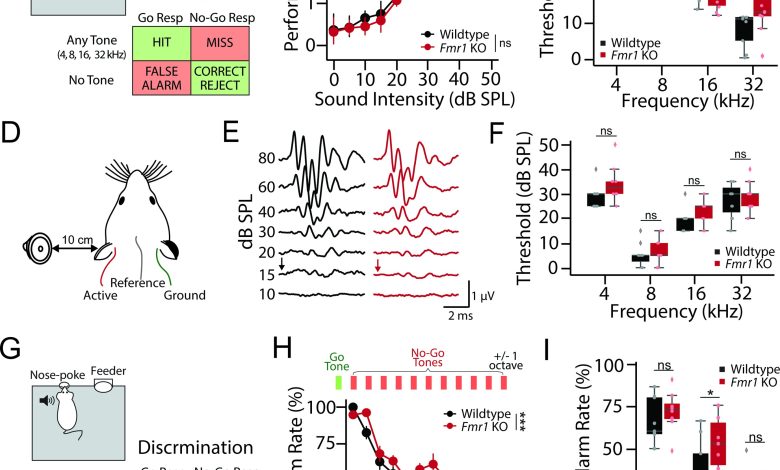 Detecção de tom normal, mas discriminação prejudicada em ratos Fmr1 KO. Crédito: Biologia PLOS (2025). DOI: 10.1371/journal.pbio.3003248