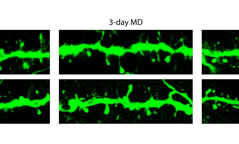 Enquanto isso, em camundongos que experimentaram DM com função normal do circHomer1, medidas de resposta neural à entrada visual mostraram que os neurônios que atendem ao olho privado mostraram a queda esperada, mas não o fizeram em camundongos onde o circHomer1 estava desativado. Quando a equipe examinou dendritos de neurônios em camundongos com circHomer1 normal, os espinhos encolheram (como esperado), juntamente com a queda da entrada visual.