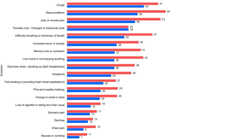 Proporção de entrevistados que relataram cada sintoma solicitado em três meses, por COVID longo recuperado versus persistente. Crédito: Epidemiologia e Infecção (2025). DOI: 10.1017/s0950268825100551
