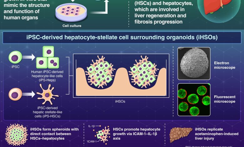 Para colmatar esta lacuna, os investigadores desenvolveram um organoide. Usando células-tronco pluripotentes induzidas por humanos (células iPS), eles geraram células semelhantes a hepatócitos (iPS-Heps) e semelhantes a estrelas (iPS-HSCs) e co-cultivaram-nas em 3D para formar organoides esféricos, com células estreladas envolvendo os hepatócitos. Descobriu-se que sua interação é mediada por ICAM-1, uma molécula de adesão, e interleucina-1β (IL-1β), uma citocina produzida por HSCs. Em iHSOs, os iPS-HSCs exibiram um fenótipo quiescente, porém rico em citocinas, e apoiaram a proliferação de hepatócitos via eixo ICAM-1 – IL-1β.