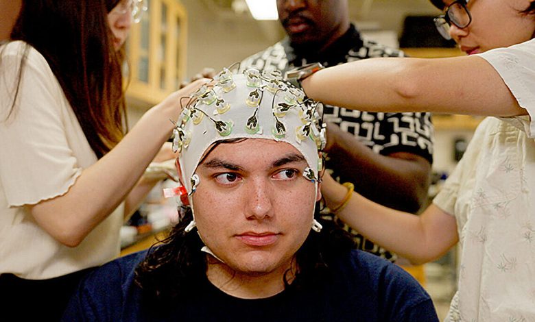 Como parte de um estudo sobre o estresse e o cérebro, os pesquisadores monitoram os sinais elétricos no couro cabeludo do participante usando uma touca cravejada de eletrodos. Crédito: Virgil Ward
