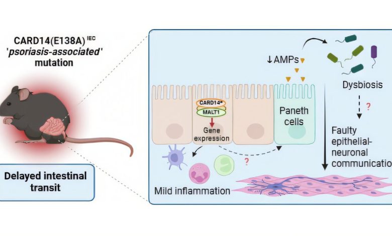 Usando um modelo de rato que expressa a mutação CARD14 associada à psoríase humana em células epiteliais intestinais (IECs), os investigadores descobriram que os ratos desenvolveram um trânsito intestinal mais lento, apesar de não terem sofrido danos no revestimento intestinal ou no sistema nervoso entérico. Tais alterações na motilidade intestinal estão associadas a muitas doenças.