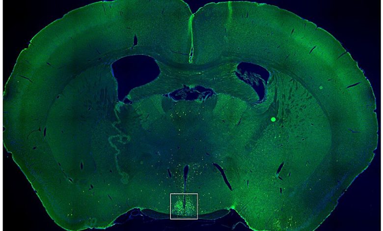 Esta imagem mostra uma fatia fina do meio do cérebro de um camundongo, com a região conhecida como núcleo supraquiasmático (SCN) cercada por uma caixa branca. Os pequenos pontos verdes marcam as células cerebrais que reagem ao hormônio da fome grelina. Quando as células sensíveis à grelina no SCN são desligadas durante o tempo normal de descanso do rato, os animais comem menos e perdem peso. Crédito: UT Southwestern Medical Center