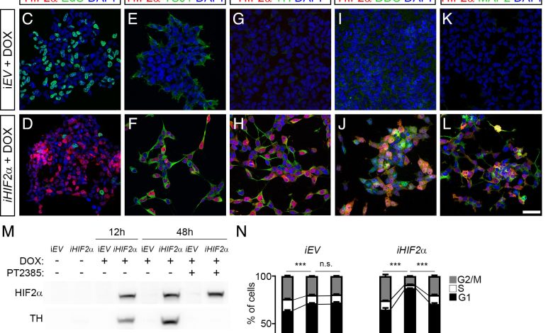 A superexpressão de HIF2α em células de neuroblastoma LAN-1 amplificadas por MYCN leva à redução da proliferação e à regulação positiva de fatores associados à cromafina. Crédito: Anais da Academia Nacional de Ciências (2025). DOI: 10.1073/pnas.2516922122