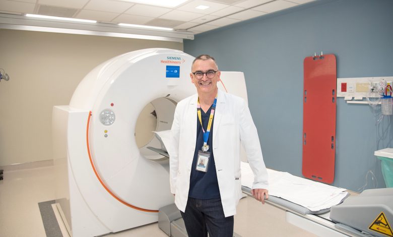 Glenn Bauman, cientista do LHSCRI e oncologista de radiação do London Health Sciences Centre (LHSC), está em frente ao scanner de tomografia por emissão de pósitrons (PET). Crédito: LHSC