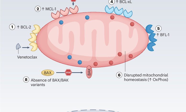 Mecanismos de resistência ao venetoclax na LMA. Crédito: Nature Reviews Oncologia Clínica (2025). DOI: 10.1038/s41571-025-01068-0