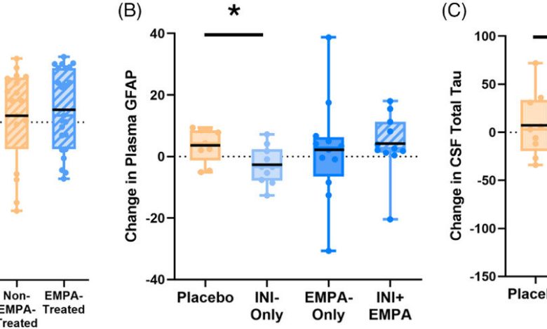 A, pontuações de alteração do mPACC5 para os grupos não tratados com INI versus tratados com INI e não tratados com EMPA versus grupos tratados com EMPA. B, Alteração na GFAP plasmática (pg/mL) para os grupos placebo, somente INI, somente EMPA e INI+EMPA. C, Alteração na tau total no LCR (pg/mL) para os grupos placebo, somente INI, somente EMPA e INI+EMPA. * Nominal p <0,05. LCR, líquido cefalorraquidiano; EMPA, empagliflozina; GFAP, proteína glial fibrilar ácida; INI, insulina intranasal; mPACC5, Composto Cognitivo Pré-clínico de Alzheimer modificado 5. Crédito: Alzheimer e Demência (2025). DOI: 10.1002/alz.70704