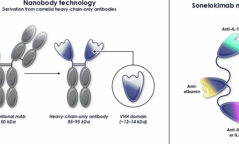 Sonelokimab é um novo nanocorpo que se liga a IL-17A e IL-17F com uma afinidade igualmente alta e foi projetado para atingir locais de inflamação de difícil acesso. Crédito: Medicina da Natureza (2025). DOI: 10.1038/s41591-025-03971-6