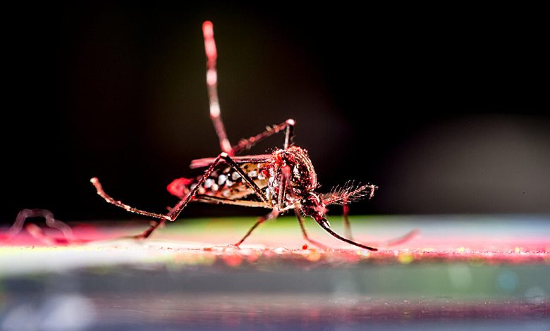 Um mosquito Aedes aegypti com pó vermelho usado para marcar o animal em um teste de comportamento. Crédito: Matt Cashore/University of Notre Dame