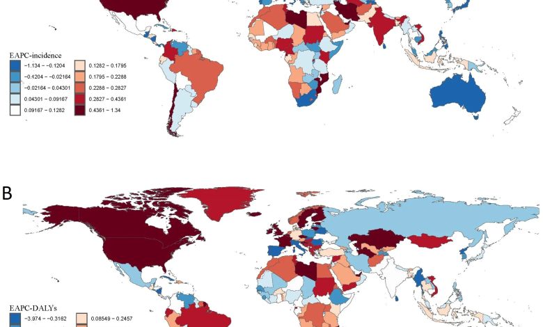 Distribuição espacial global da alteração percentual anual estimada (EAPC) em transtornos de uso de drogas (DUD), 1990-2021. (A) EAPC em taxas de incidência padronizadas por idade de DUD entre regiões e países. (B) EAPC em anos de vida ajustados à deficiência (Dalys) de DUD entre regiões e países. Crédito: Fronteiras em psiquiatria (2025). Doi: 10.3389/fpsyt.2025.1647269