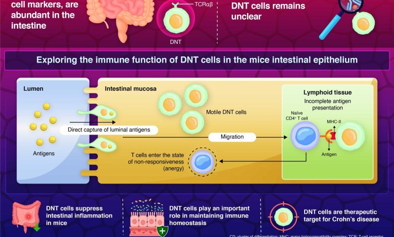 Isso foi confirmado através de estudos em camundongos com inflamação intestinal. Mais importante, também foi descoberto que as células DNT de pacientes com doença de Crohn (uma condição inflamatória intestinal) também apresentaram captação e apresentação prejudicadas de antígenos.