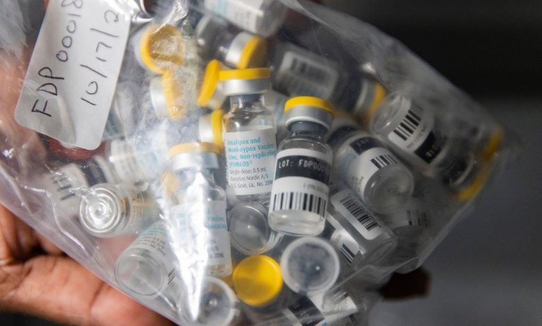 Frascos da vacina Jynneos para varíola dos macacos são retirados de um refrigerador em um local de vacinação, em 29 de agosto de 2022, no bairro do Brooklyn, em Nova York. Crédito: AP Photo/Jeenah Moon, Arquivo
