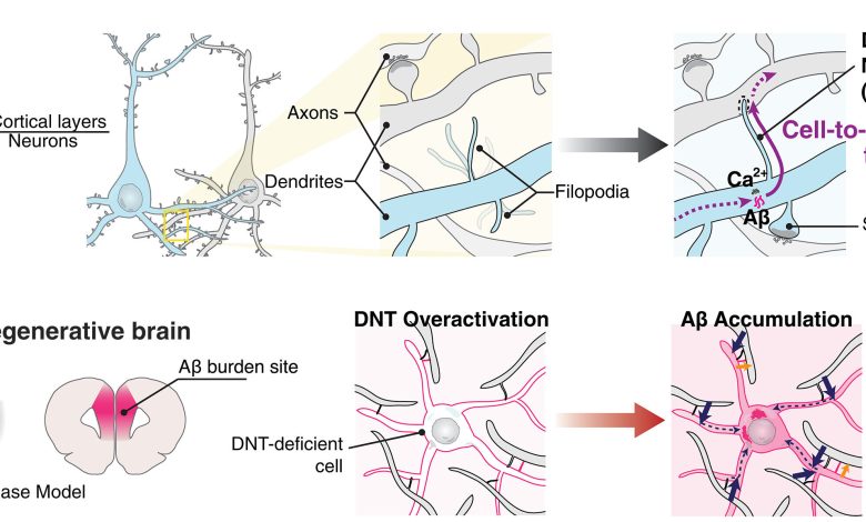 Agora, um grupo de cientistas identificou um novo tipo de nanotubo que parece estar atuando como uma espécie de ponte, transportando materiais entre dendritos – as projeções ramificadas nos neurônios. O estudo, publicado em Ciênciadescreve o que o grupo chama de “nanotubos dendríticos” ou DNTs e seu possível relacionamento com o acúmulo do peptídeo amilóide-beta (Aβ), que é visto com a doença de Alzheimer.