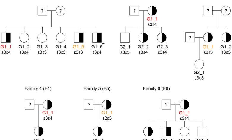 Gráfico de pedigree das seis famílias (na coorte da variante genética) com portadores variantes Trem2 H157Y. A cor corresponde ao diagnóstico clínico: vermelho, laranja e preto indicam doença de Alzheimer, comprometimento cognitivo leve e cognitivamente normal, respectivamente. Crédito: Alzheimer e demência (2025). Doi: 10.1002/alz.70586